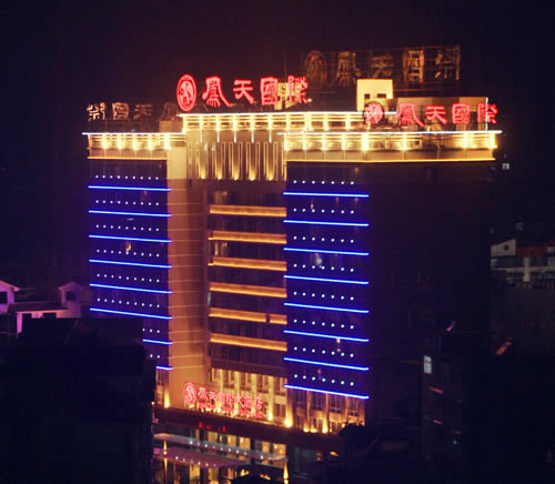 鳳凰鳳天國際大酒店總投資2.68億元,13層至尊高度。總面積30000多平方米,氣宇軒華。共有300余間豪華客房。地下停車場,會務中心,健身中心,中西餐廳,咖啡廳,等配套設施一應俱全。集會展、旅游、休閑娛樂于一體,卓爾不凡,盡顯大家風范。宴會廳是目前鳳凰最大,可同時容納1000人就餐。