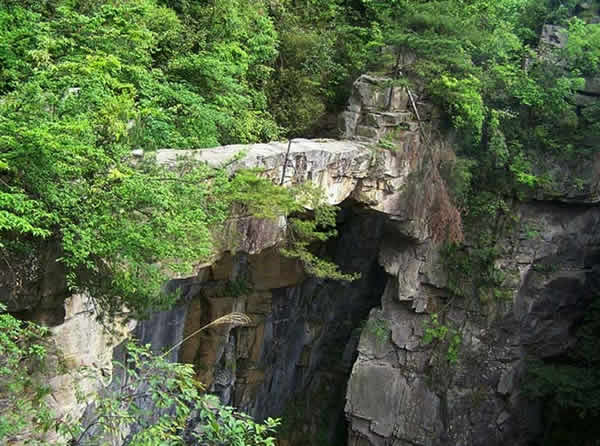仙人橋又稱天下第一橋,坐落在猴子坡上、天子峰下的王爺洞對面。橋屬自然形成,長26米,寬1.5米,厚一米多,高約六七十 米,飛架在兩岸懸崖絕壁之上,鬼斧神工,惟妙惟肖,古人云:“天地可掬,此真天造也”。仙人橋為紅砂巖結構,兩端生有高大的黃山松和杜鵑樹,濃蔭掩映,極其美麗。橋的東頭還有自然形成的石級,人可順石級而下,走上天橋,下視萬丈深淵,令人頭暈目眩,非健壯者不敢逾越,旅游者無不贊嘆,說它是“天下絕景”。