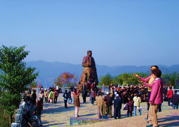 在茶盤塔的西南側,有一座海拔1200多米高 的山峰,這就是“天子峰”。天子峰,看上去活象一位偉人,他坐在那里,身披鐵甲,右手握箭,濃眉隆起,兩眼怒視前方,似正要指揮千軍萬馬出征,大戰(zhàn)一場。這個形象就是人們傳說的向王天子,所以取名叫“天子峰”。