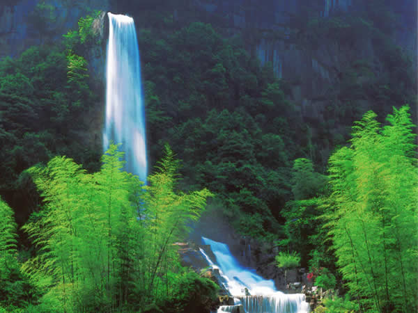 寶峰湖瀑布 湖中有兩座疊翠小島,近岸奇峰屹立,峰回水轉(zhuǎn)。泛舟漫游,只見一湖綠水半湖倒影,充滿詩情畫意!霸铺萑f丈上天臺,高峽平湖一鑒開,王母瑤池金扶,浣沙仙女下凡來”游寶峰湖,你就會欣賞到這樣的詩情畫意。群峰擁抱的寶峰湖,長約2.,5公里,湖猶如一面寶鏡,四面青山,一泓碧水,蕩槳溫游,格外愜意。坐在船上,環(huán)顧四周,千山聳翠,俯視水中,倒影慢移,碧水照相館得群峰綠,人面桃花水映紅。真是靜極了,美極了!韓劇《九天洞》拍攝的湖水就是寶峰湖。