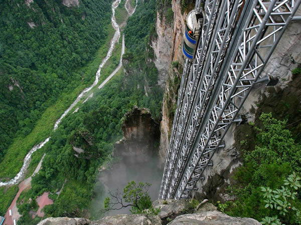 百龍電梯位于世界自然遺產(chǎn)張家界武陵源風(fēng)景區(qū)。工程分布在4.5公里,垂直高差385米的核心景區(qū)。電梯運行高度326米,主體由154米山體豎井和172米貼山鋼結(jié)構(gòu)井架等組成,采用三臺雙層全暴露觀光電梯并列分體運行。是連通森林公園、金鞭溪、水繞四門到袁家界、烏龍寨、天子山的重要觀光交通設(shè)施。百龍?zhí)焯莨こ毯陚、工藝?fù)雜,施工驚險,堪稱“世界工程奇觀”。它的建成創(chuàng)造了三項基尼斯世界紀(jì)錄。
