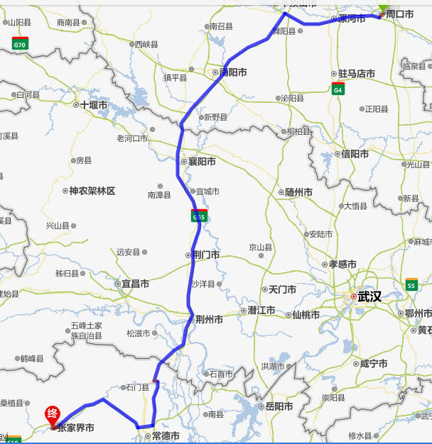 左右,沿途經過周口——漯河——平頂山——南陽——襄陽——荊門——荊州——常德(也可以走國道經澧縣、石門縣)——慈利——張家界。
