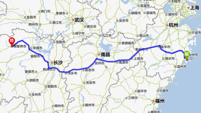 左右,沿途經過溫嶺——金華市——衢州市——上饒市——鷹潭市——新余市——宜春市——萍鄉(xiāng)市——株洲市——湘潭市——寧鄉(xiāng)縣——益陽市——常德市——慈利縣——張家界。
